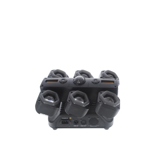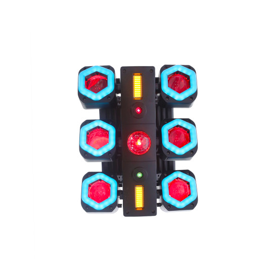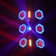 Il combine plusieurs technologies pour créer une animation riche et immersive : 6 projecteurs LED RGBW 15W, des anneaux LED RGB, des strobes intégrés, un laser rouge & vert ainsi qu’un sphéro rotatif.