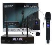 Le MW 200 PT est un double micro sans fil fournie avec un micro main et un serre-tête de type PLL multifréquences de chez Power Acoustics, Il est composé d'un récepteur 2 canaux. Simple d'installation et efficace, ce système peut être utilisé pour les discours ou le chant. Il peut être raccordé à une enceinte active ou à un système amplifié.